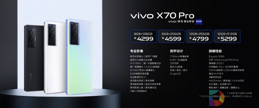vivo X70系列售价在发布会中公布,vivo X70 Pro 8GB+128G版、8GB+256GB版、12GB+256GB版和12GB+512GB版本价格分别为4299元、4599元、4799元以及5299元;vivo X70 Pro+ 8GB+256GB版、12GB+256GB版和12GB+512GB版本售价分别为5499元、5999元以及6999元;vivo X70售价3699元起。