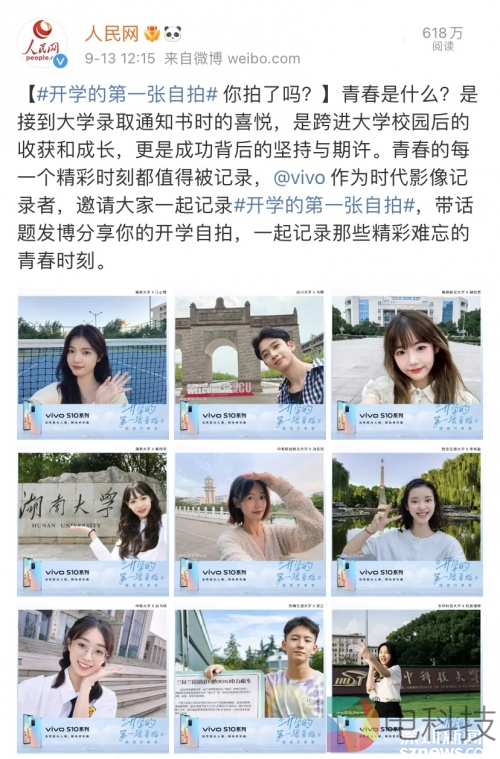 视频上线后不久,vivo又联合人民网在微博发起晒出#开学的第一张自拍#活动。多所高校在vivo S10 Pro系列手机的协助拍摄下,用照片定格下了大一新生真实而又坚定的面孔。