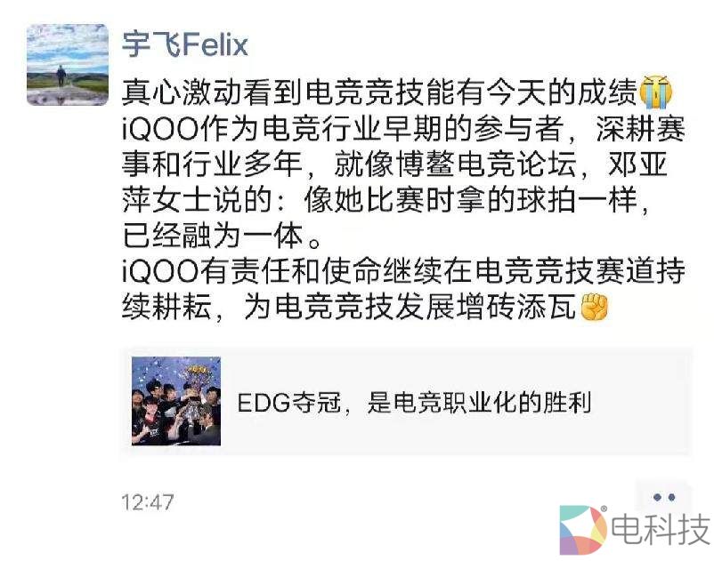 11月7日,EDG夺冠之后,iQOO品牌总经理冯宇飞在朋友圈转发相关文章并评论:真心激动看到电竞竞技能有今天的成绩。iQOO作为电竞行业早期的参与者,深耕赛事和行业多年,就像博鳌电竞论坛,邓亚萍女士说的:像她比赛时拿的球拍一样,已经融为一体。iQOO有责任和使命继续在电竞竞技赛道持续耕耘,为电竞竞技发展增砖添瓦。