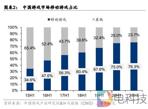 艾媒咨询数据显示,中国移动电竞用户规模逐年增长,2018年中国移动电子竞技行业为3.02亿人,至2020年已到达3.83亿人,预计在2022年将达4.18亿人。而中国游戏市场移动游戏占比,也从2015年的34.6%激增到2021年上半年的76.3%。随着中国移动端游戏的职业化发展不断成熟,其用户规模将进一步扩大,移动电竞已然成为电竞行业的重要增长点。