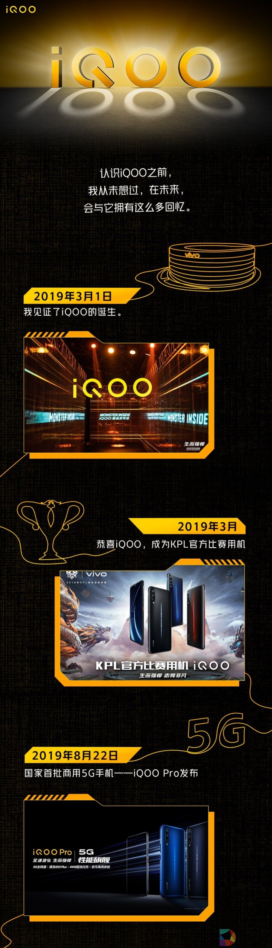 iQOO自2019年3月1日诞生以来,以“生而强悍,探索不止”作为品牌内涵,追求“探索之悦”的品牌精神,坚持用顶级性能和顶级电竞,为用户带来一流的操控体验。从第一代iQOO起,便通过了KPL最严苛的比赛机测试认证,成为KPL独家官方比赛用机,与选手一同征战2019KPL春季赛。2019年8月iQOO Pro在北京正式发布,获得国家首批商用5G手机认证。2020年8月,基于对性能和速度的一致追求,iQOO还成为BMW M Motorsport全球顶级合作伙伴。同时,iQOO 5系列率先推出120W FlashCharge闪充技术。2020年9月23日,一支由粉丝自建,怀揣挑战极限的热血战队成立,酷客战队。2021年8月23日,周深成为「iQOO酷玩大师」并发布“生而为赢”单曲。