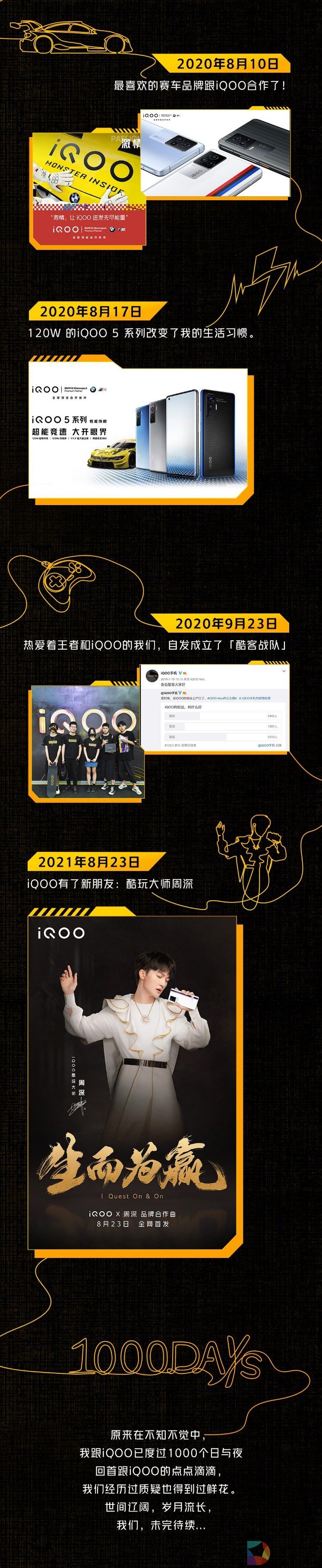 2021年11月25日感恩节当天是iQOO品牌诞生1000天之际,iQOO官方微博发布主题为"iQOO千天,强悍同行"的海报,与酷客共同回顾品牌自诞生之初至今的重要历程。此外,当日晚
