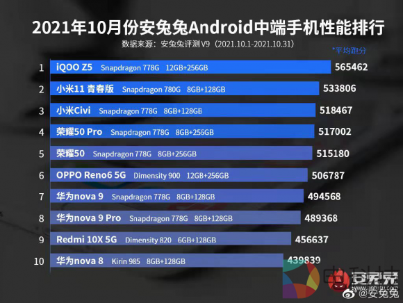 在性能方面,该机则带来了骁龙778G+满血版UFS 3.1+满血版 LPDDR5的豪华配置,这套硬件组合在千元产品上并不多见,再加上iQOO自身对于硬件的出色调优,为这款千元旗舰带来了强劲的性能表现。而在此前安兔兔发布的中端安卓机性能排行榜中,这款机型也毫无悬念地夺得了榜单第一的佳绩,其强力性能表现可见一斑!
