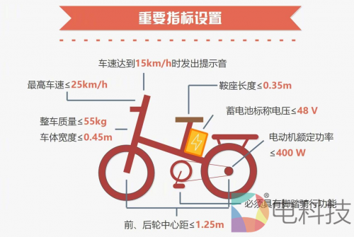 根据《电动自行车安全技术规范》要求,全面规范了电动自行车各项安全性和指标:3C认证、脚踏骑行能力、整车质量(包括电池)不能超过55千克、最高时速不超过25公里、电机功率不超过400瓦、蓄电池标称电压不超过48伏等等,同时,增加了“防篡改、防火性能、阻燃性能、充电器保护”等安全技术指标。该标准的执行也主要是规范电动车行业的发展,防止部分厂商使用安全性差的材料生产电动车,从而更好的保障人们出行。