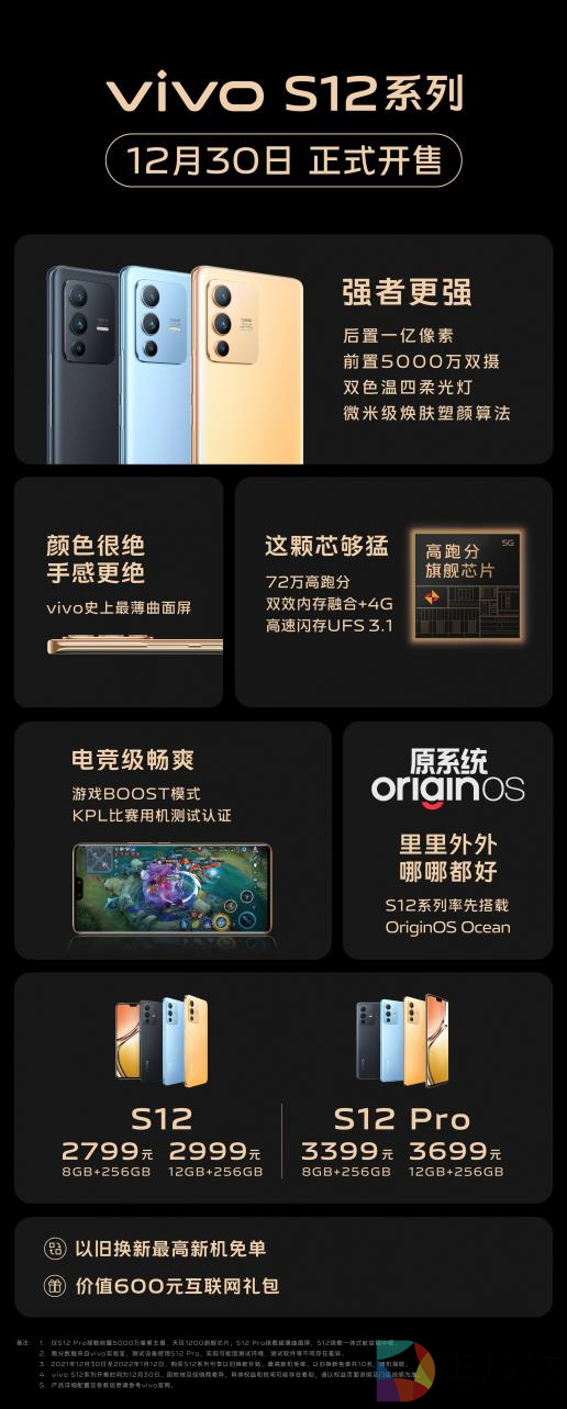 12月30日,vivo官方发布开售海报,官宣新一代先锋影像旗舰vivo S12系列正式全网首销。后置1亿像素+前置5000万双摄、vivo史上最薄曲面屏、高跑分旗舰芯片、电竞级体验,以及OriginOS Ocean系统,vivo S12系列真正做到了“里里外外、哪哪都好”。现在购机,以旧换新最高可享新机免单,还可获得价值600元的互联网礼包。