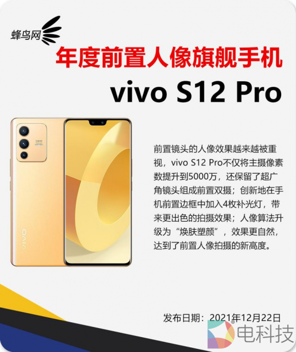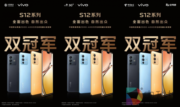先锋影像旗舰vivo S12系列一经开售,便凭借轻薄优雅的设计、自然出色的影像体验与综合强悍的性能获得了主流媒体的一致点赞。首销当日获得了迪信通、国美、京东五星电器、苏宁易购等九大平台销量、销售额双冠军。2022年1月6日,vivo S12 Pro又获得了“年度前置人像旗舰手机”称号,影像实力再获认可。