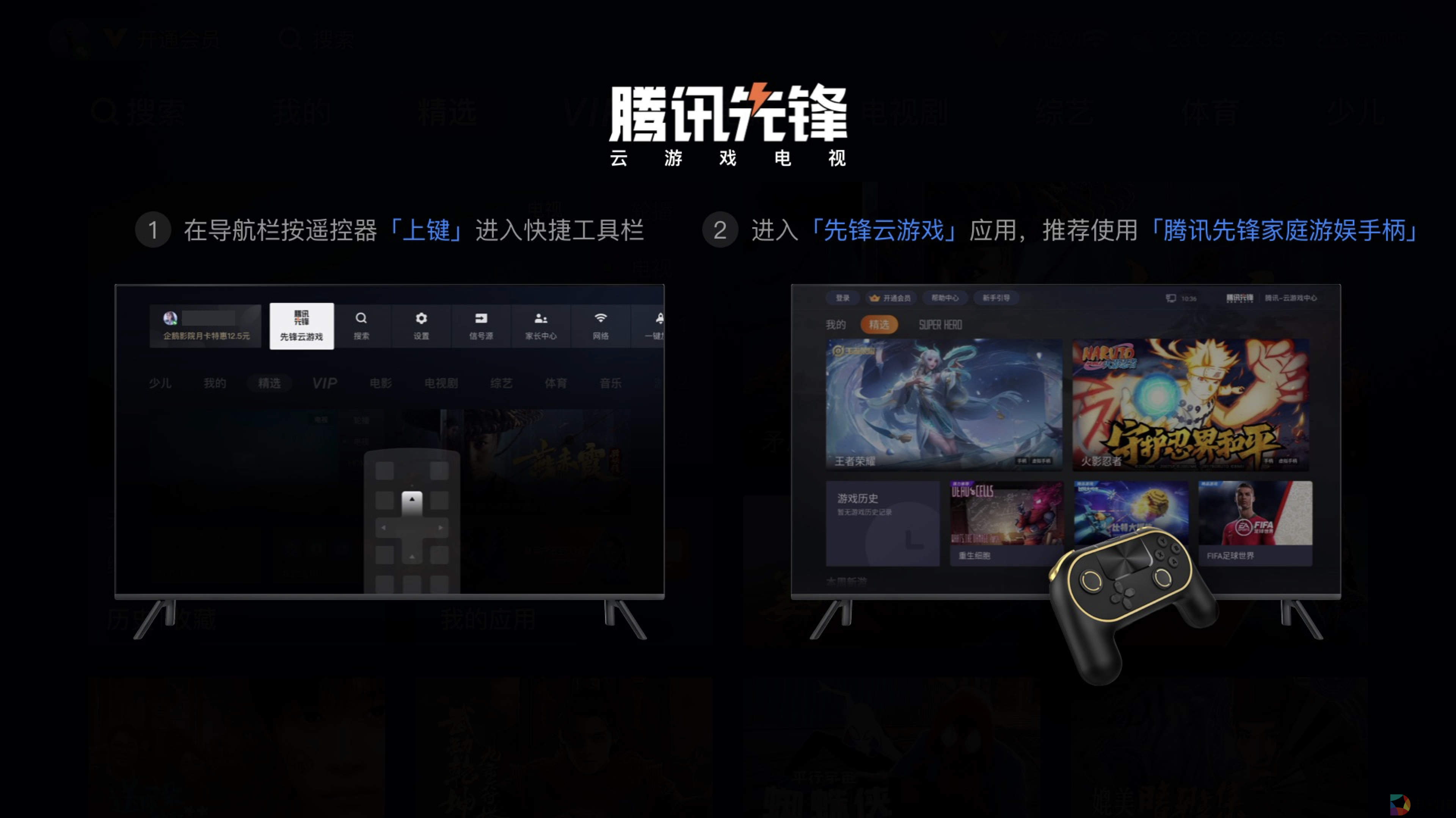 ——云游戏升级大场面,畅玩不设限"在家里,随手打开电视畅玩精品游戏,独乐乐,更可众乐乐"是玩家们常描绘对客厅娱乐的美好愿景。腾讯先锋云游戏致力