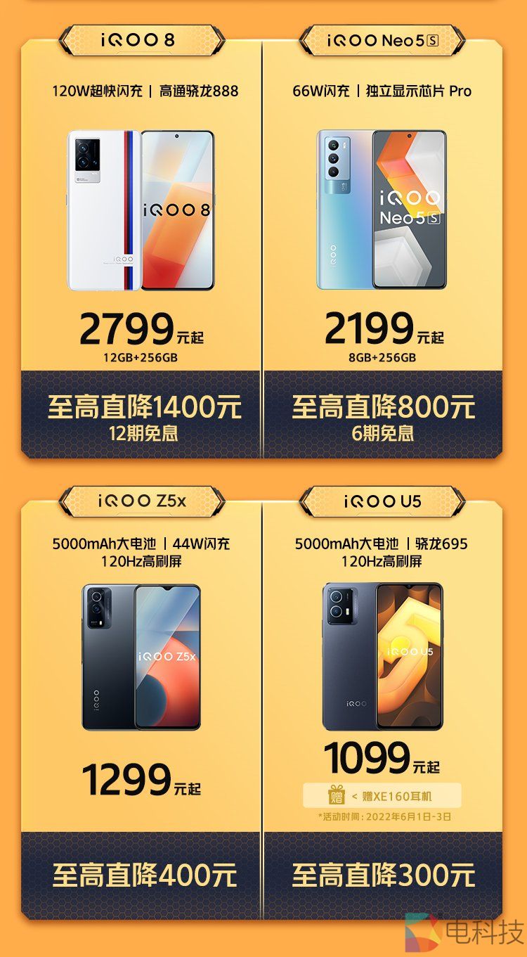 5月31日晚20点,今年618开门红活动如期到来,手机厂商之间的福利攻略满天飞,就此拉开了竞争序幕。其中年轻手机品牌iQOO也上线了618购机福利攻略,涵盖了全价位段机型,至高直降1400元,还有至高1000元大额神券等你抢。这里敲黑板,iQOO此次618开门红活动时间在5月31日20点-6月3日24点,618全程价保,想换机的朋友先看看下面的手机清单。