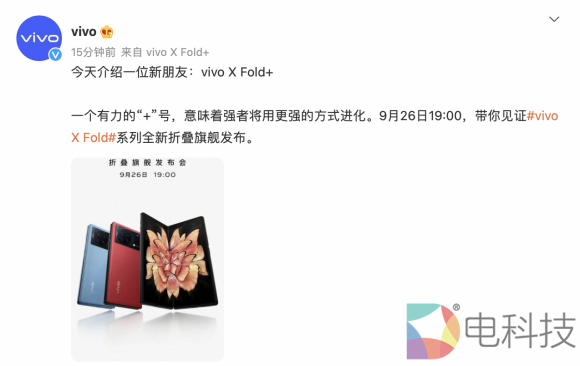今天,vivo官方微博正式宣布,新款折叠屏手机X Fold+将于9月26日正式发布。在此之前, 已有媒体曝光X Fold+部分配置,包括将会新增华夏红配色,以及搭载规格更高的处理器、有线充电