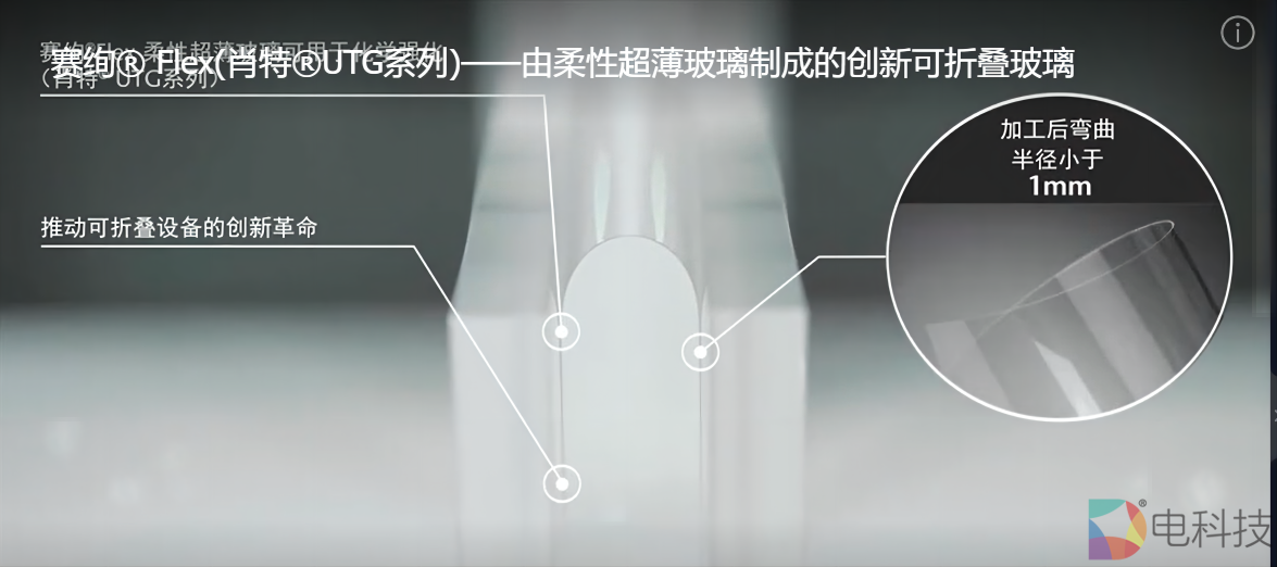 在这场折叠手机的“轻薄革命”,少不了肖特® UTG超薄玻璃的助力,提升屏幕体验,形成差异化竞争。肖特®UTG是首款实现量产的超薄玻璃,已有超过30年的经验积累。其中,肖特®UTG系列产品中的赛绚®Flex是市面首款可化学强化的超薄柔性玻璃,加工后可实现小于1毫米的弯曲半径,打破玻璃的弯曲极限,并成为贯穿智能手机更新迭代过程中“轻薄”、“坚固”两大主题的完美解决方案,推动了柔性显示屏的革命。