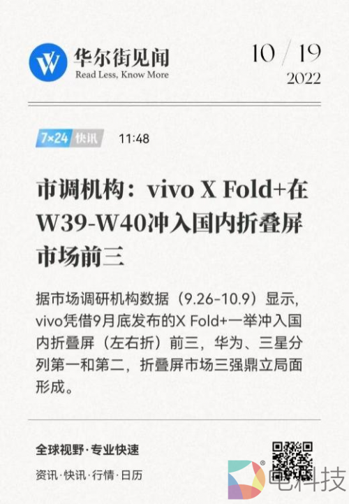 自9月26日推出以来,凭借在设计、性能、体验等方面的全面提升,vivo X Fold+成为了目前折叠屏手机市场最为炙手可热的产品之一。日前,市场调研机构发布数据(9.26-10.9)显示,vivo凭借X Fold+一举冲入国内折叠屏(左右折)前三,与华为、三星一起形成折叠屏市场三强鼎立的局面。