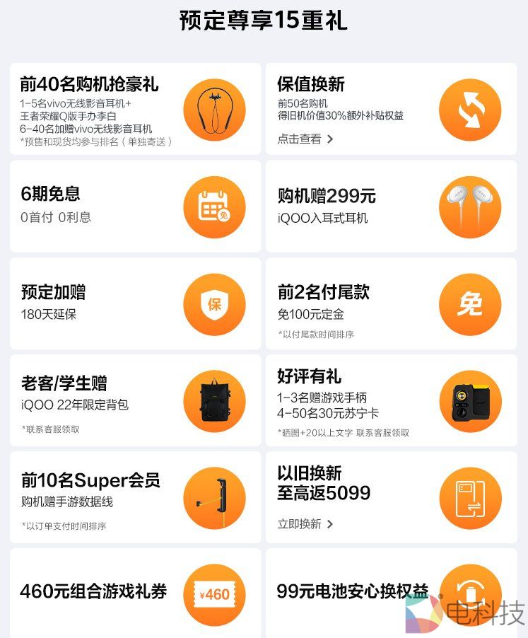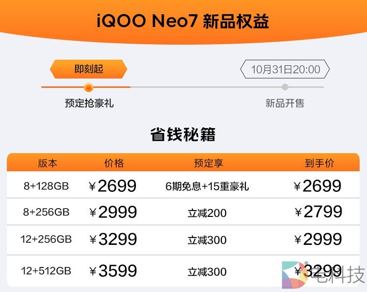 即日起到10月31日20点前,用户下单预定iQOO Neo7可以享受诸如6期免息、加赠180天延保、前40名购机抢豪礼、以旧换新至高返5099等15重福利。