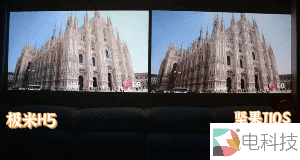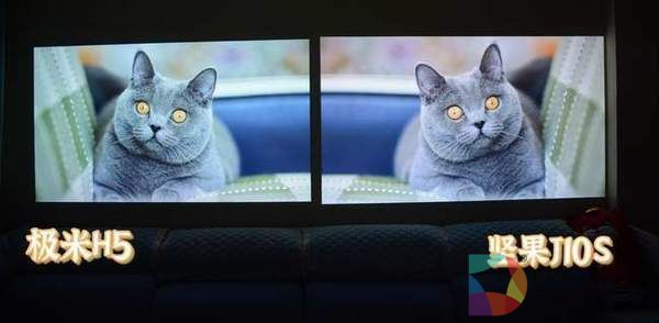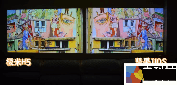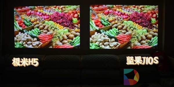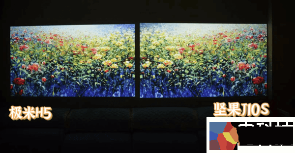 极米在色彩和亮度上的表现都是非常优异的,只是在两者的协调性以及色准上,坚果的表达相对来说要更准确一点。从下面的图像显示对比上也能窥探一二,虽然极米H5在颜色和亮度上都比坚果的更亮更饱和,但是整体的画面感觉,坚果J10S更让人舒适,在颜色表现上要更真实柔和一些,观感更好。
