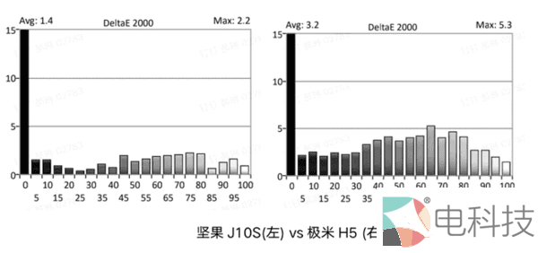 而在色准上,坚果J10S实测中做到了平均 1.4 的 DeltaE,而极米H5则是3.2。