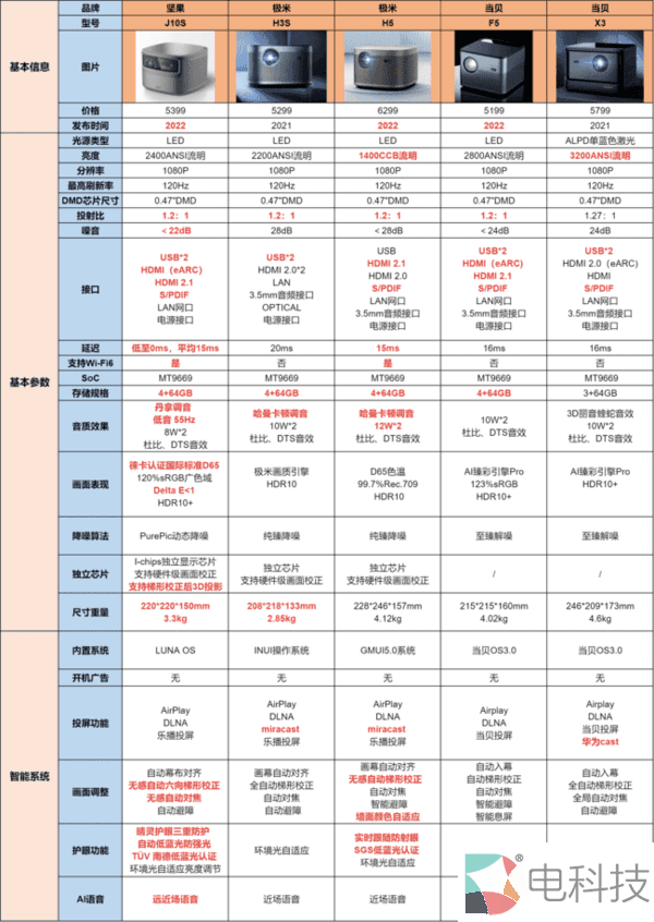 上述表格比较详细的记录了各个投影的基本情况,经过对比,其中坚果J10S和极米H5,无论是在参数表现上还是技术层面上都是比较优秀的存在。