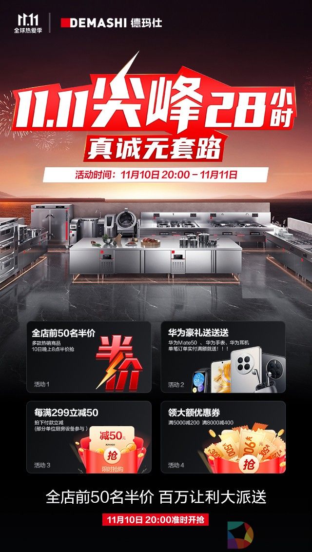 据了解,“德玛仕疯狂双十一,单位采购也尽兴”正火热进行中!整体厨房套购更加划算,11月10日晚上八点,上京东,搜德玛仕,单位厨房设备五折起!同时,单笔订单实付满额就送华为产品,还有部分产品也将参加京东官方活动,每满299立减50,还有大额的优惠券可领取。对于蒸饭柜有需求的采购们,此时给单位采购就是给单位省钱了,赶快前往德玛仕线上各大官方店铺咨询客服吧。