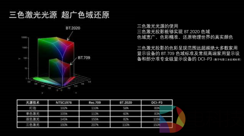 激光光源与灯泡光源和LED光源完全不同,首先,激光的颜色很纯,因此可以根据需要直接挑选特定波段的RGB三原色激光器。而光学三原色RGB(红绿蓝)可以混合出其他各种颜色,因此RGB三原色激光器可以做到色域覆盖超过100% BT.2020,远超当下所有的民用级投影设备。