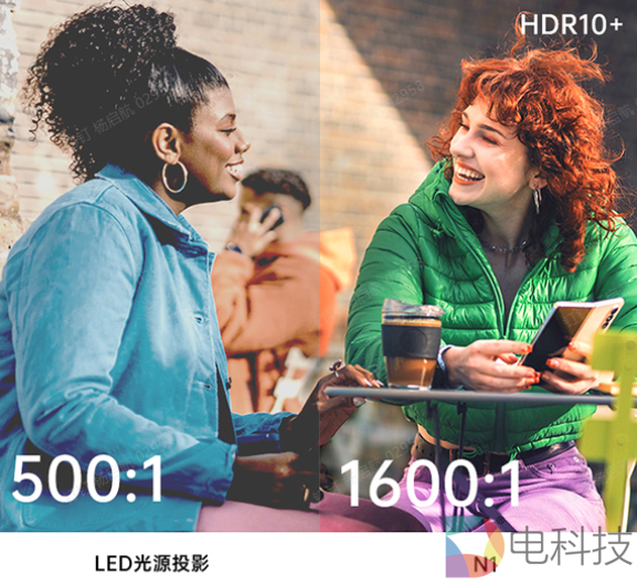 对比度方面,目氪™光机展示出来的是超高的原生对比度,坚果N1的对比度达到了1600:1,是LED的3倍多。配合HDR10+的动态对比度提升,让N1投出来的画面亮部更亮但不过爆,暗部更暗却保留有更多细节,画面因细节丰富而更有质感。