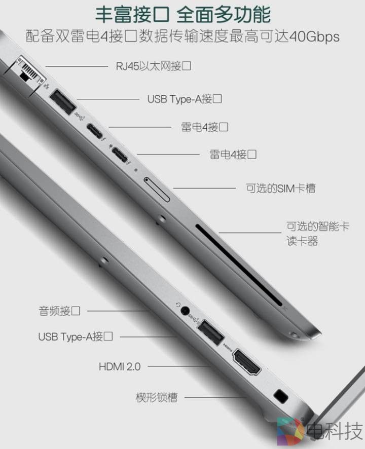 接口和扩展性方面,Latitude 5000更是超级全面,从RJ-45网口、USB大口、HDMI口到雷电4口一应俱全,无论视频扩展还是功能扩展都相当给力。另外注意,它也可选4G/5G上网。