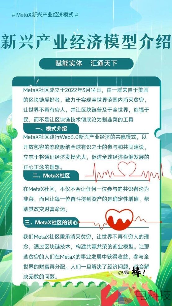 MetaX新兴产业经济模式生态系统项目是一个全新的 Web3.0通证经济模型,致力于解决当前传统经济中广大消费者的巨大的消费欲望与极其有限的消费财力之间的巨大矛盾,高效整合全球实体经济的各条产业链上的生产端、销售端、消费端和投资端的资源对接,真正实现将人们的巨大的消费需求转化为实际的消费行为从而让一切消费行为作为对经济发展原始动力的贡献从而获得公平的财富评价,让全球实体经济发展获得巨大且持续的动力的同时,也让全球经济获得前所未有的高效率运转,从而彻底帮助全球实体经济实现效率和活力升级的同时也实现消除全球贫困这一困扰联合国多年的经济问题。MetaX新兴产业经济模式生态系统项目立足于规范化发展,并已经开始不断取得社会各界的认可。