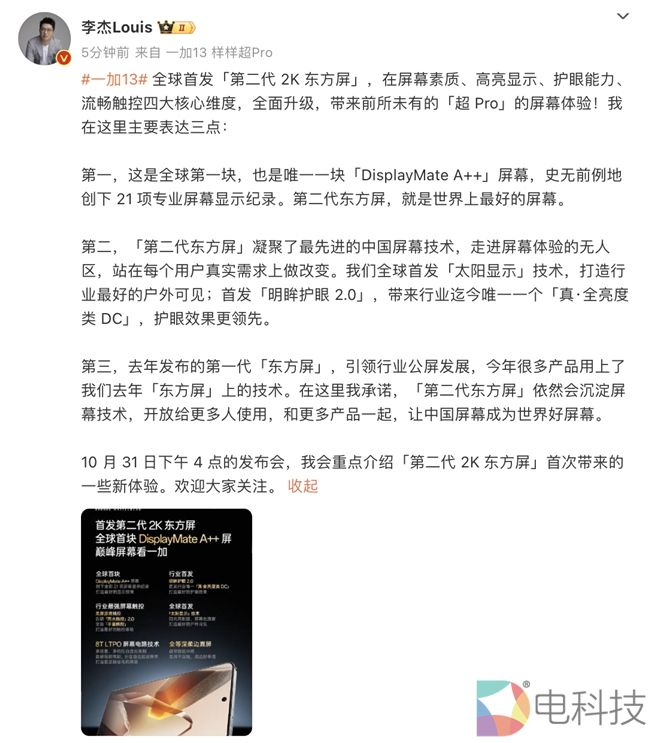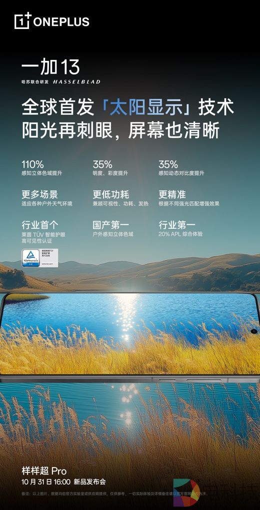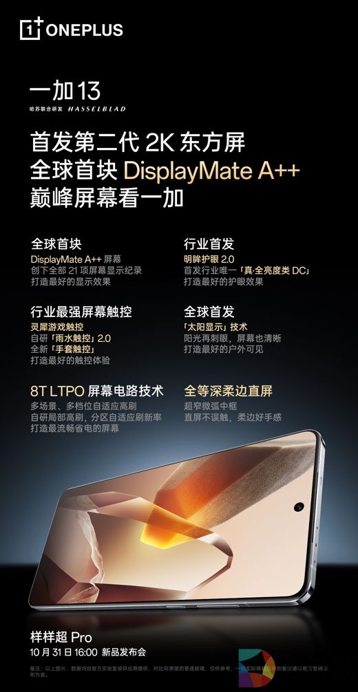 基于在屏幕素质、高亮可见、护眼能力以及流畅体验四个维度带来的巅峰体验,第二代东方屏将彻底打破行业标准天花板。除了这块全球顶级的满分好屏外,一加 13 作为一加品牌新十年年度旗舰之作带来产品力的全方位升级,旗舰体验样样超 Pro,外观及材质采用全新「破晓」设计语言,呈现超 Pro 的美学质感;同时,在骁龙 8 至尊版移动平台基础上,提供同档唯一 24GB+1TB 超级存储,释放超 Pro 的满血性能;此外,搭载哈苏影像大师及同档唯一潜望长焦,带来超 Pro 的旗舰影像体验。一加 13 将于 10 月 31 日正式发布,更多新品信息敬请期待。