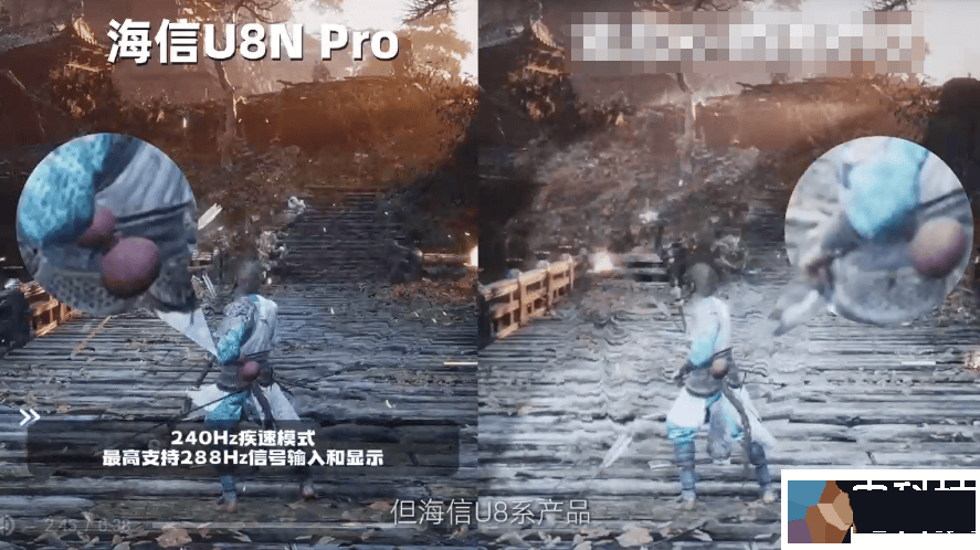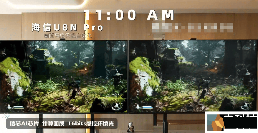 而针对PC游戏这类高动态、高光影效果的画面,两者的画质也能看出区别。比如在《黑神话:悟空》的游戏场景对比中,竞品S的画面明暗、色彩对比度都挺好,只是缺乏一定的景深和层次感;海信电视U8则能够通过超画质Mini LED芯片的优化处理,呈现出丰富的色彩层次,从飞沙走石到水波粼粼,每一个场景都充满了视觉冲击力。