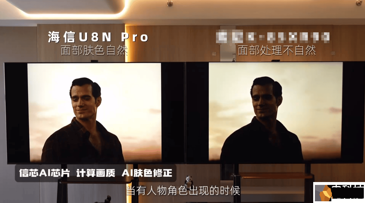 以观影场景的对比为例,竞品S和海信电视U8的清晰度都很高,人物细节也有,美中不足的是竞品S中的人物肤色感觉有些不自然。海信电视U8通过AI肤色修正后,人物肤色更接近真人质感,观感上更加舒适。