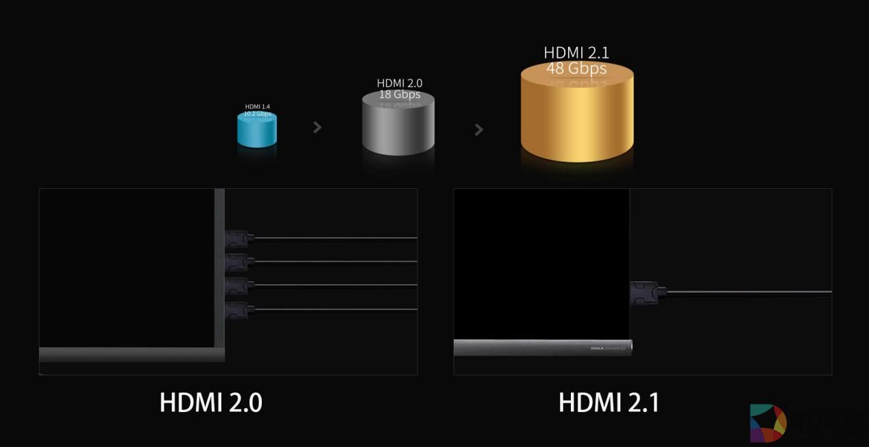 真8K电视需配置8K电视需配备HDMI2.1的传输接口,拥有48Gbps的传输速度。在HDMI 2.1标准下,一根线就可以完美传输8K内容,而在HDMI 2.0标准下则需要连接4根HDMI线。