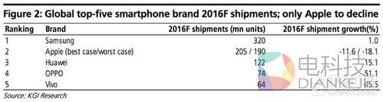 在分析报告中,郭明池预计今年苹果iPhone设备的总出货量可能会出现下滑,出货量总数最好的情况可能为2.05亿部,相比去年减少12%;最差预计 为1.9亿部,低于2014年的出货量总数1.93亿部。在报告中列举的前五名手机品牌中,苹果可能将成为唯一一个在2016年出货量下滑的品牌,而其余 四个品牌分别为三星、华为、OPPO、vivo。