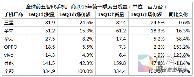 今年第一季度全球智能手机总出货量为3.349亿部,与去年同期的3.343亿部相比仅增长0.2%,创下有记录以来的最小同比增幅。