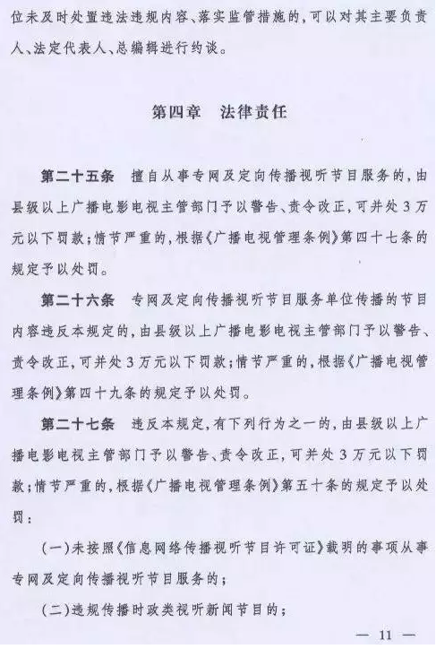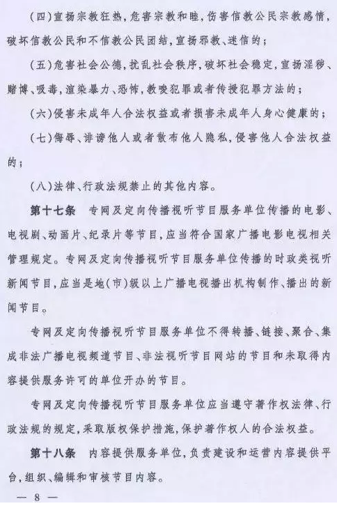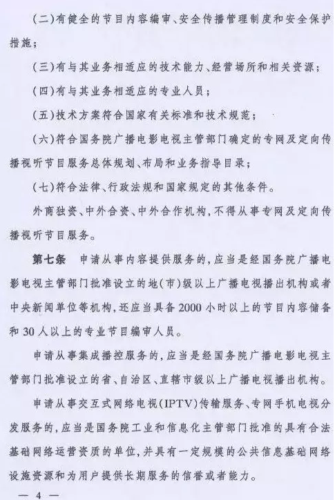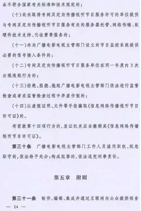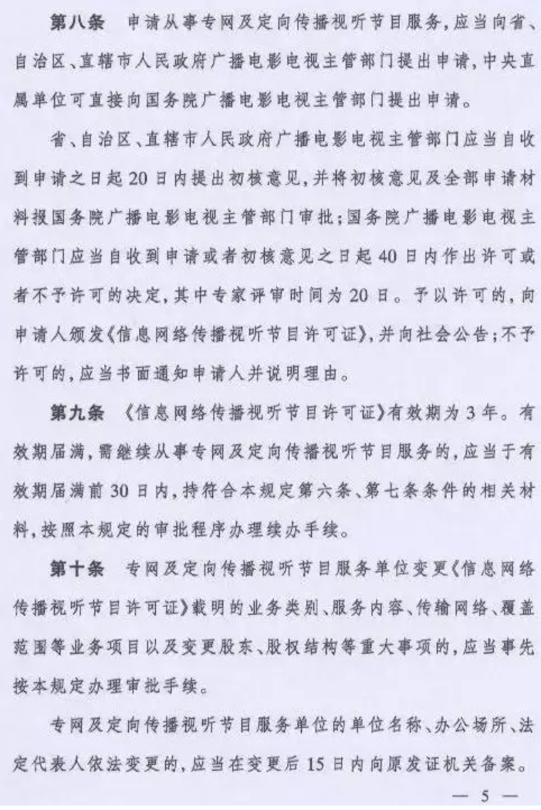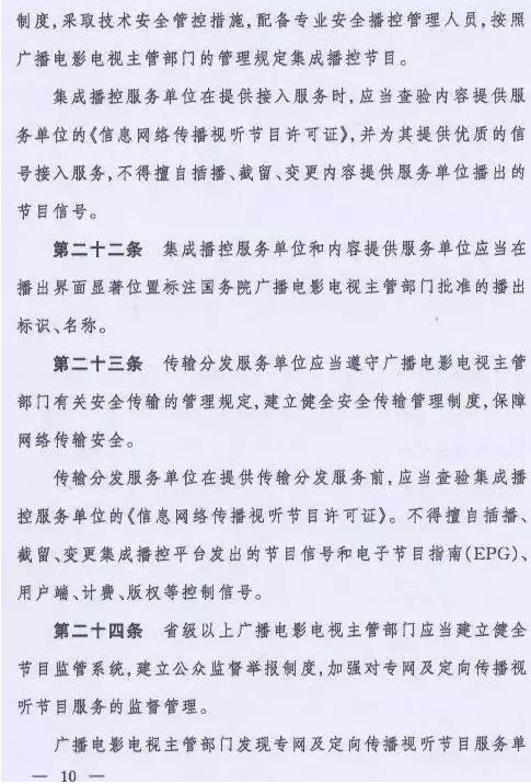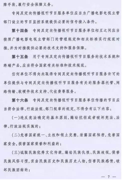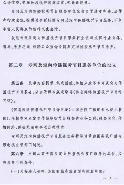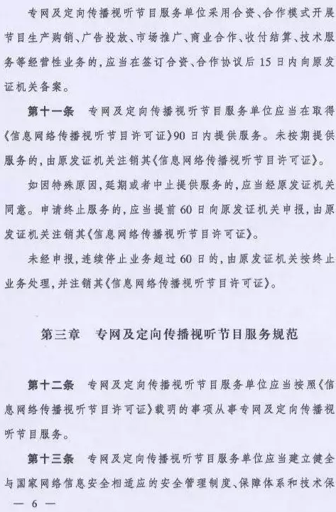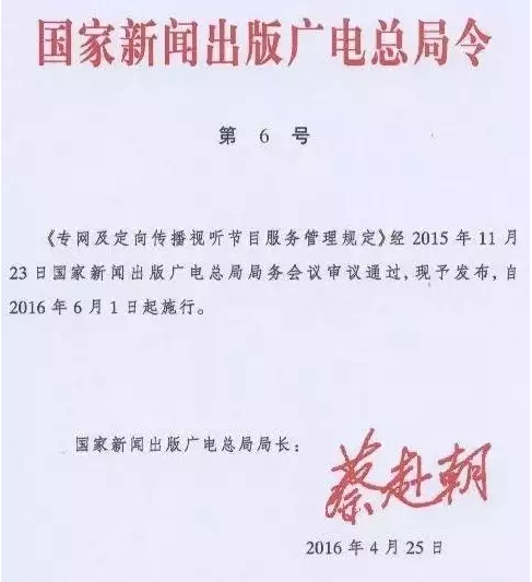 取而代之的是国家新闻出版广电总局令(第6号)《专网及定向传播视听节目服务管理规定》,该规定将从2016年6月1日起施行。