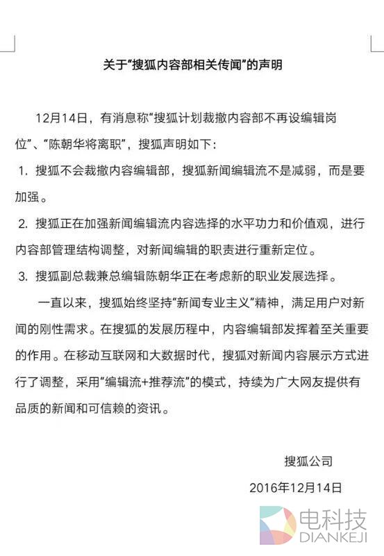 12月14日,有搜狐内部人士向腾讯科技独家证实,搜狐内容部将进行大改革,自媒体权重将会进一步加大,而陈朝华将离职。不过,并不一定会裁撤编辑岗位。