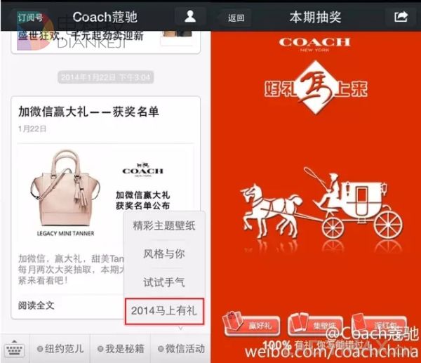 另外,Burberry 还在微信上推出过中国农历数字红包,只需点击、扫一扫、摇一摇便可打开 Burberry 经典新春贺礼,同时还可以为亲朋好友定制个性化新春数字红包,通过微信平台共同庆祝新春佳节。而 Coach 更是早在 2014 年就跟微信合作推出微信红包游戏,在 Coach 版本的红包中,用户可以获得不同面值的 Coach 礼品券。