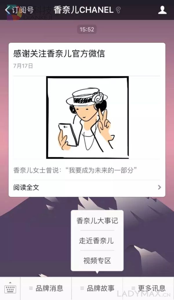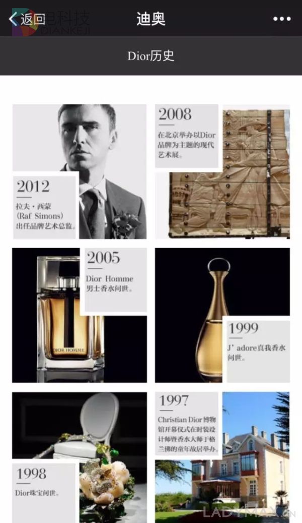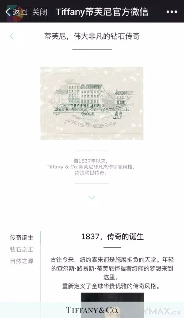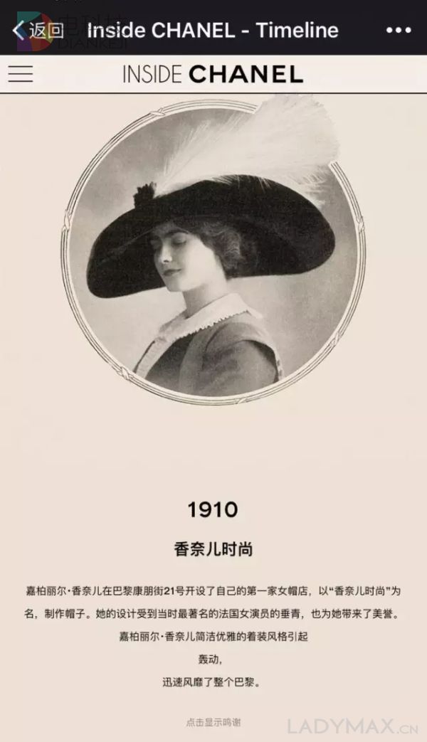 除了以讲故事的方式推送文章,这类奢侈品微信号还会以讲故事的方式介绍品牌发展历程、创始人理念以及其他新闻动态。例如,Tiffany 在微信公众号中以一段长文介绍了品牌创始至现在的传奇历程;迪奥以一个个缩略图的小链接串联了品牌传承的历史;而香奈儿则是以一个精心设计的 H5 界面介绍了香奈儿女士的传奇人生以及香奈儿品牌发展的大事记。