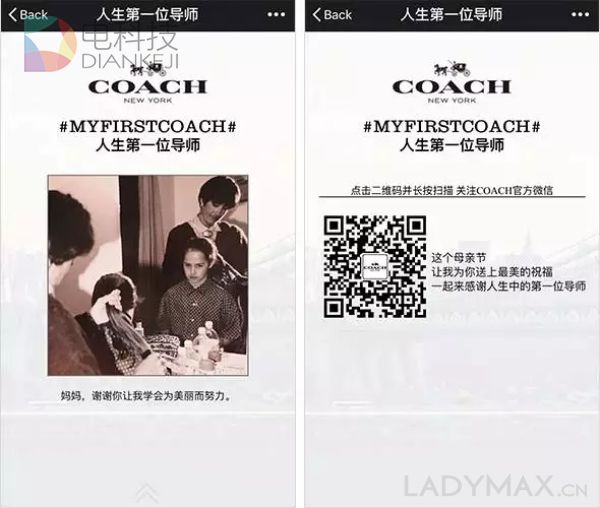 例如,对于数字平台及社交媒体的热衷 Coach 来说,它就曾在 2015 年的母亲节利用朋友圈信息流广告配合推出的 #MyFirstCoach (人生中的第一位导师)UGC 营销战役中做了个不错的案例。用户通过点击朋友圈广告上显示的链接,可直接跳转到 Coach 制作的 H5 界面,除了能欣赏到一支专门为母亲节打造的温情广告片之外,也邀请大家通过添加 Coach 官方微信号参与「上传母女合照」的 UGC 活动。这一次的母亲节朋友圈信息流广告,得到了超过 10 万的微信用户的点赞,Coach 公众号的订阅者也一下子增加了 3.5 万人,带来了不小的反响。除此之外,CaLouis Vuittonin Klein 也曾选择朋友圈广告来配合其 #myCaLouis Vuittonins 的营销战役。