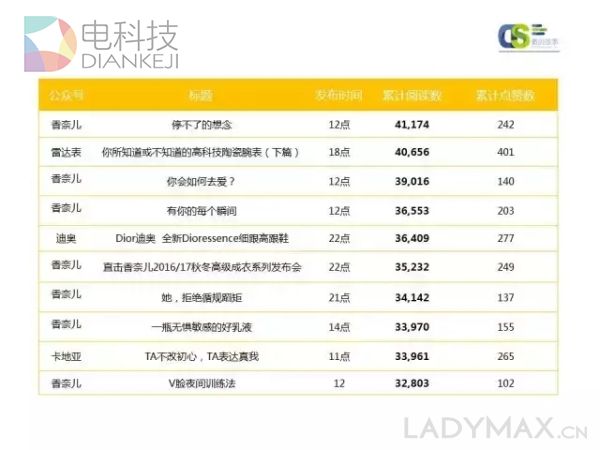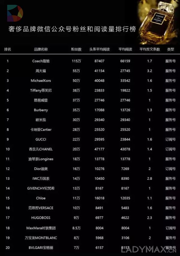 LADYMAX发布的《奢侈品牌微信影响力排行榜》 注:该表统计时段为2016年1月1日至3月25日