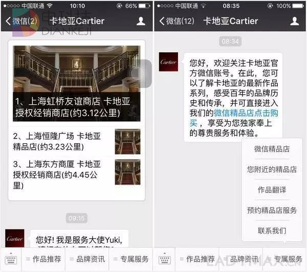 根据今年 L2 的 Digital IQ Index®: Luxury China 报告指出,有 53% 的奢侈品牌已经使用了地理位置获取信息功能,却只有 15% 的品牌开通了海外地理位置。这一点上,「Digital IQ」上排名第 4 的卡地亚(卡地亚)就走出了一条特色的「路线」,将目光放在了海外出境游的中国消费者身上。卡地亚借助微信的 LBS 定位功能,关注者只需要发送自己所在的位置,就能立即获取最近的门店地址、地图、联系方式和导航信息。用户还可以通过卡地亚微信平台预约到店服务并在结束后进行评分。