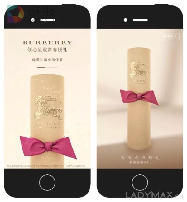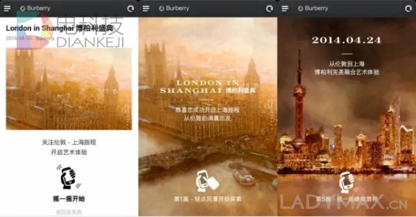 2014 年 4 月, Burberry 品牌在官方微信上分享了 Burberry 盛典台前幕后故事,盛典举办之前,用户可通过摇晃、轻拂、点击手机屏幕,观赏伦敦及上海的著名城市地标美景,感受由伦敦抵达上海的奇妙旅程;盛典结束后,微信用户可通过 Burberry 官方微信平台置身 360 度动态场景中,仿佛亲临现场。之后最让消费者关注的莫过于用户可以在微信上实时观看时装发布秀,只要把 Burberry 的公众号加到自己的微信通讯录里,就能看到秀场动态、模特走台、观看时装秀的设计师和名人的评论等内容。