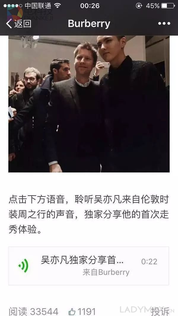 去年 2 月,Burberry 与微信合作在平台内嵌上 2014 秋季时装秀的 App 应用。该功能包括从前排视角体验看秀,Angelababy 还提供了语音点评。而在 2016 年秋冬男装系列秀场中,Burberry 不仅将在线上线下都具有较强号召力的吴亦凡纳入麾下,还在微信发布了 22 秒的吴亦凡独家语音感言,吸引了不少年轻消费者。