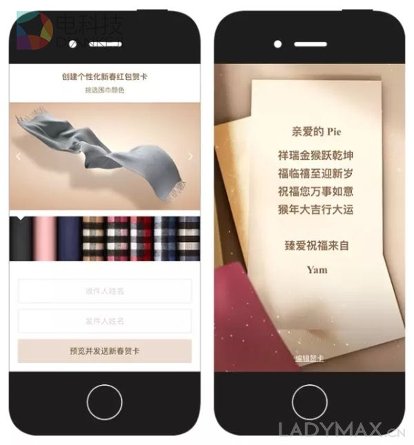 除了能看时装秀,Burberry 在微信上还提供了不少互动功能。例如今年春节,他们就联手微信推出了「新春悦礼」活动,为用户献上专属互动祝福定制体验。用户可以定制具有私人印记的围巾、姓名饰牌、专属香氛,输入自己名字的首字母屏幕上就会出现一瓶印有字母组合图案的产品,以及如何购买它的具体信息。另外,还可以创建个性化新春红包贺卡,写上专属祝福,挑选一款适合的 Burberry 围巾发送给身边的亲朋好友。