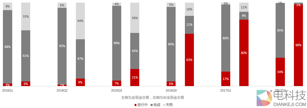 截止至2017年6月30日,2016年第一季度公告的并购交易中,非全现金交易的失败率为33%,而全现金交易失败率仅为9%。发股交易因须经证监会审批而失败率较高。在去年至今监管收紧的大趋势下,众多交易在中概股回A、跨界收购、规避借壳等方面易触及监管红线而被迫终止。