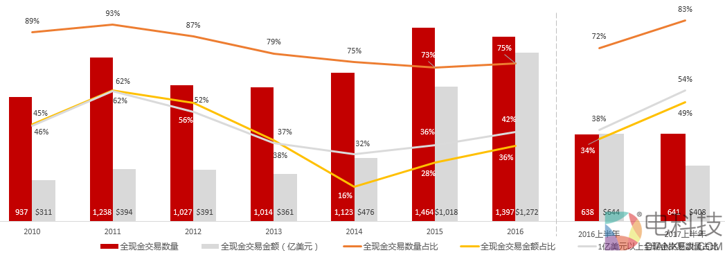 交易金额在1亿美元以上的大额交易中,全现金收购的数量占比从2014年的32%增长至2017年上半年的54%,增长更为明显,说明通过全现金收购规避并购重组审核的趋势确实存在,同时也反映了上市公司因股价低迷对发行新股有一定的惜售情绪,其中部分典型案例包括宣亚国际收购映客48%股权、大连电瓷收购紫博蓝100%股权等。
