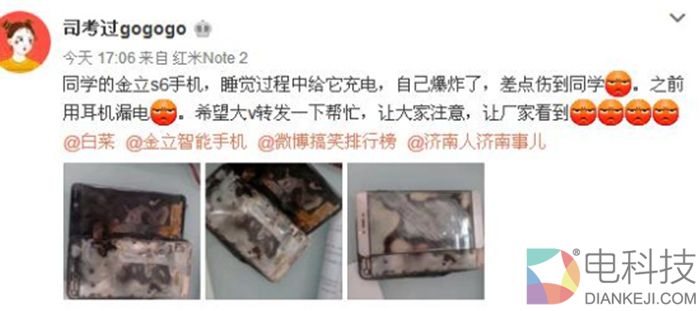据微博博主@司考过gogogo 爆料:我们是济南山师的学生,我同学的金立s6手机充电爆炸了!差点伤到同学!