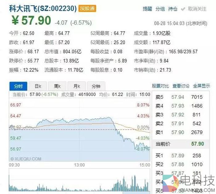 一直以来,科大讯飞(002230)被称为“人工智能第一股”。5月份开始,股价涨势迅猛,市值近千亿。然而,在8月27日讯飞的股价却开始了毫无征兆的闪崩跳水,8月27日-28日两个交易日累计跌幅10%,市值瞬间蒸发。