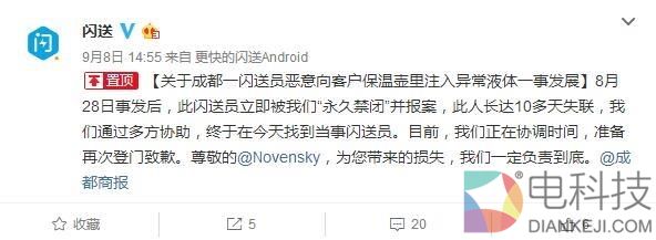 肖涛没想好处理解决方式,快递方闪送于9月8日下午第一次通过微博表态回应:“8月28日事发后,该闪送员立即被我们‘永久禁闭’并报案,此人长达10多天失联,我们通过多方协助,终于在今天找到他。目前,我们正在协调,准备登门致歉。尊敬的收件人谭先生,为你带来的损失,我们一定负责到底。”当天,闪送运营总监从北京飞到成都专门处理此事,称这是公司成立以来最奇葩最恶劣的事件。第二天,运营总监开车跟到青城山见到了收件顾客谭先生,向谭先生道歉。