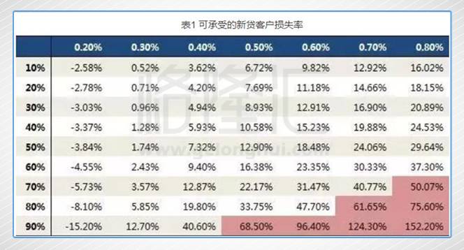 较高的违约风险必然需要较高的利率去覆盖,尽管大数据基本成为现金贷的「标配」。但是到了现金贷这里,真正的护城河是——高利率 (高手续费=变相的高利率)。一位业内人士告诉笔者, 这个行业普遍的坏账率在20%以上,但依然暴利,某家知名的大型平台,最开始的坏账率接近50%,但是每个月还可以挣3千万,基数大,服务费高"在这在逻辑上,躺着也能来钱。下文计算的表格也从盈利模式的角度证明了这一点。在客户结构一定的前提下,利率越高,可承受的新贷客户损失率也会增加。要划重点的一点是,很多互联网金融产品打出日利息率虽然很低,但是高手续费+高服务费,也是一样的完美收割啊。