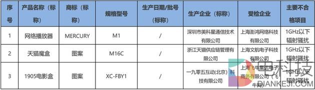 抽查发现,标称深圳市美科星通信技术有限公司生产的“MERCURY”网络播放器M1型号、浙江天猫供应链管理有限公司生产的“天猫魔盒” M16C型号、一九零五互动(北京)科技有限公司生产的“1905电影盒”XC-FBY1型号,被检出1GHz以下辐射骚扰项目不合格。