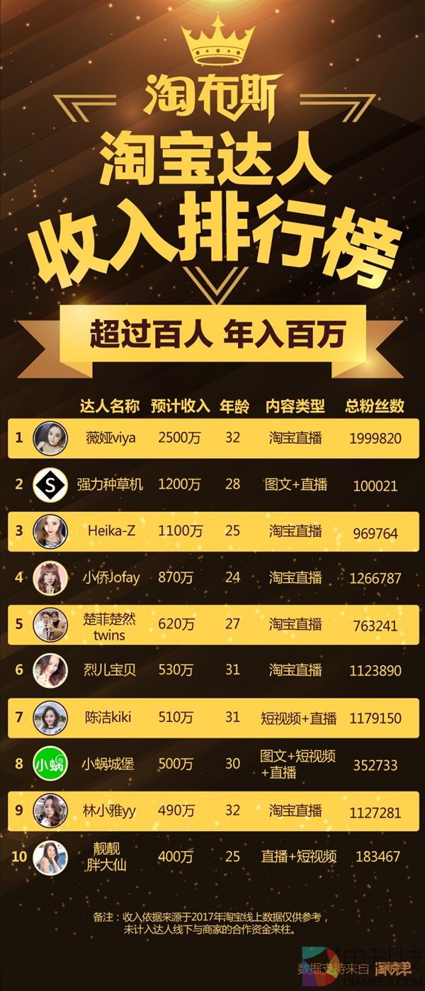 淘宝已成含金量最高的内容创业平台。12月5日,淘宝发布达人收入排行榜(以下简称“淘布斯”),首度向外界揭秘了淘宝达人的收入情况。榜单显示,32岁的薇娅以年收入2500万高居榜首,远超以《人民的名义》问鼎2017年度编剧作家收入排行榜的周梅森。而淘宝达人“强力种草机”则以1200万元的年收入紧随其后,达人“Heika-Z”以100万元的微弱差距排名第三。