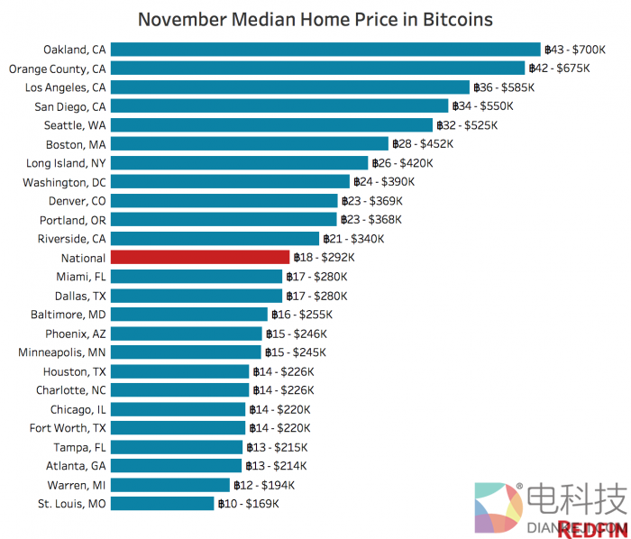 Redfin在全美范围内发现了75个卖家提到他或她会接受比特币付款。迈阿密的一个公寓出售人只要求用比特币支付; 这将花费买方33个比特币。