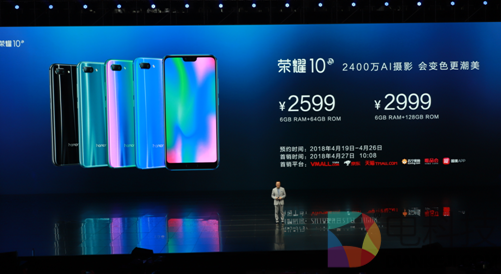 此次发布的荣耀10此次共包含两个版本:其中6GB+64GB版本售价2599元,6GB+128GB版本售价2999元。更让人惊喜的是,在ID设计上荣耀10对潮流美学又有了全新理解,在推出海鸥灰、幻夜黑两款配色之余,更迎合年轻人对潮美变色的青睐,业内首推“幻影蓝”、“幻影紫”变彩极光色,流动变幻的极光幻影给年轻消费者带来差异化的炫酷潮流体验。另外根据销售政策,4月19日-4月26日,荣耀10将在华为商城、京东、天猫荣耀官方旗舰店、苏宁易购、国美以及唯品会6大平台开启预约,4月27日10:08正式面向用户开售。